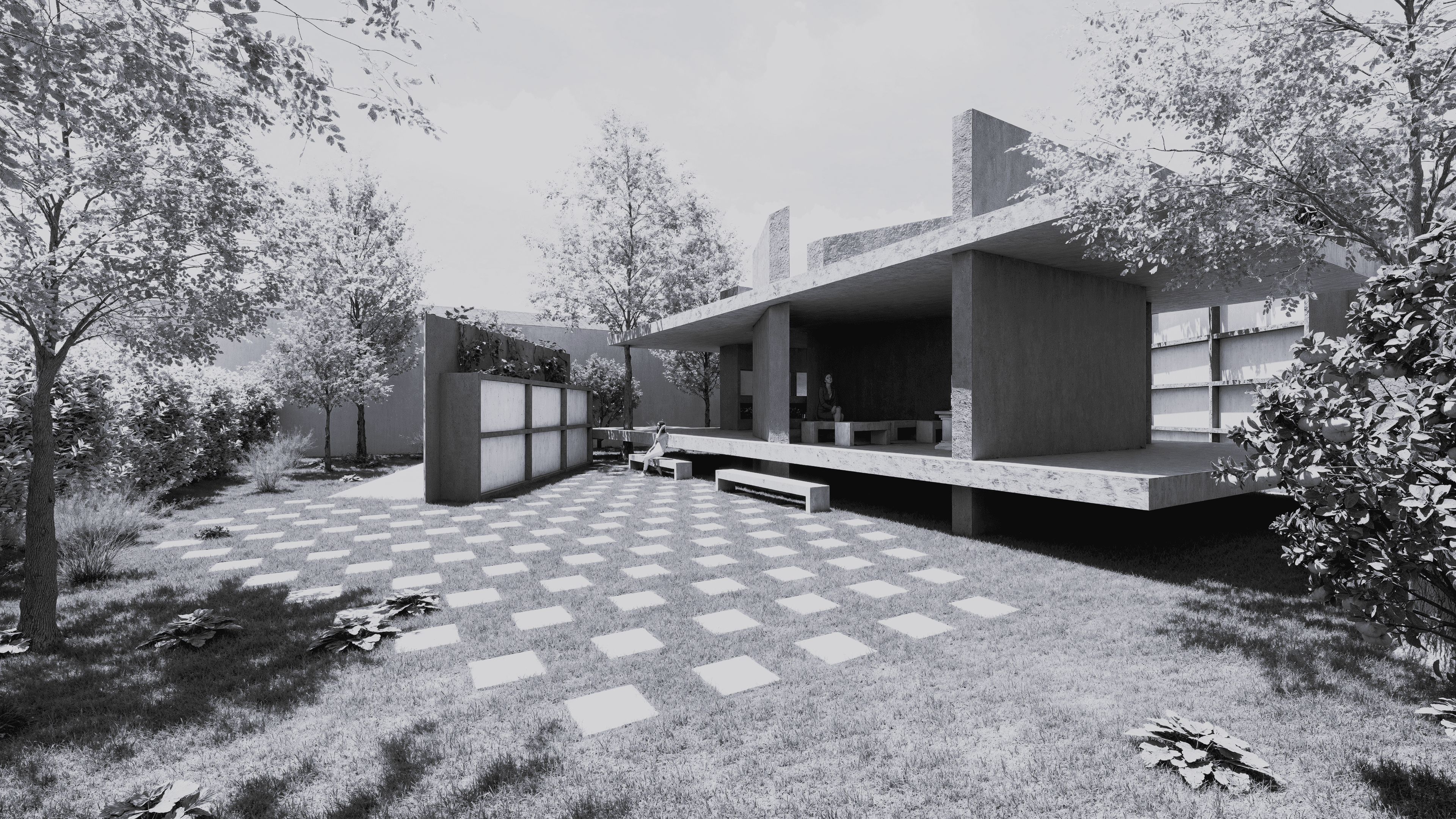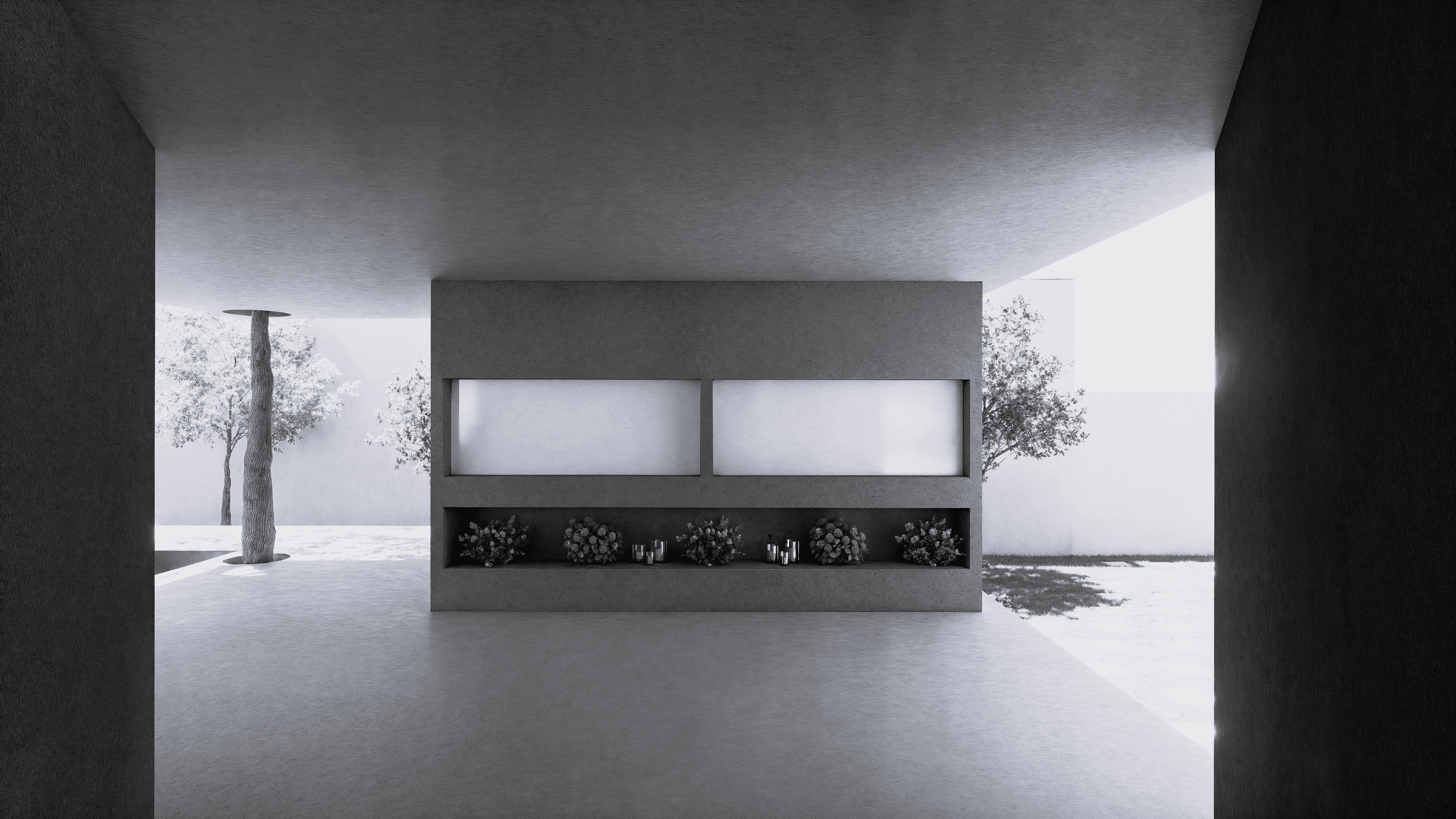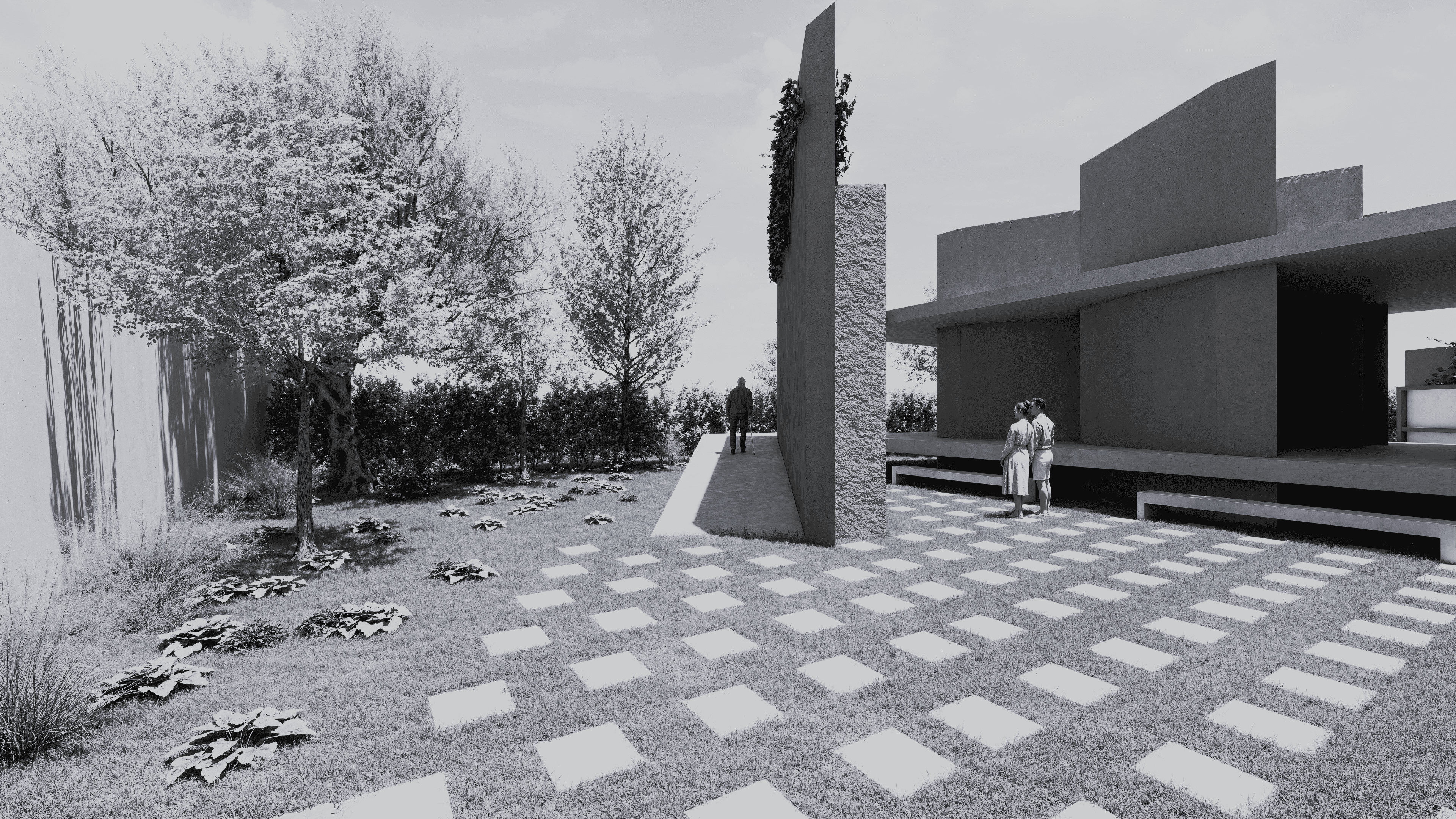 VIA LUCIS (The Path of Light). The mausoleum is conceived as a metaphor for human passage—not as a finished being, but as the client thinks of himself, as a traveler on a journey toward a destiny that transcends him: heaven. Its labyrinthine path, with clearings and thresholds, expresses the condition of constant search, of moving forward and endless hope. We created an open space, a humble intervention where concrete descends upon the meadow, and a light roof shelters what the singular walls enclose. The labyrinth is proposed as a duality: some will experience it with curiosity and wonder; others, in sorrow, will seek refuge within it. Architecture, marked by rhythms of light and shadow, embodies the duality of life: the fragile against the eternal, the transient against the absolute. The sun now measures time, slipping between the walls to illuminate the central space, composed of the altar and the tomb. Vegetation embraces the architecture, becoming part of it and it is nature that softens the austerity of concrete, reminding that even in eternal rest, life continues to pulse. Thus, the client´s mausoleum takes shape: an architectural piece articulated with the essential, yet imbued with symbolic and spiritual value that transcends matter.