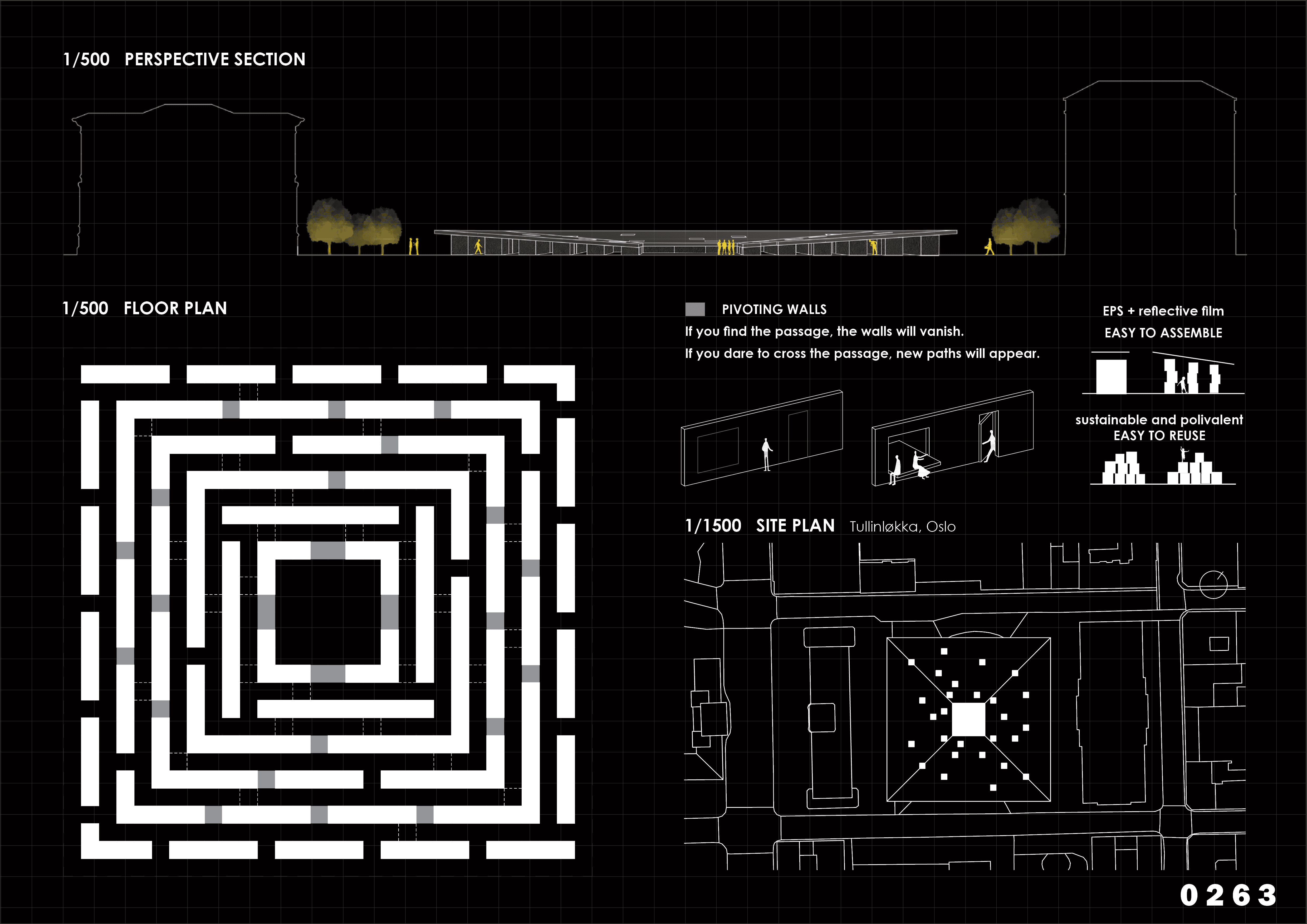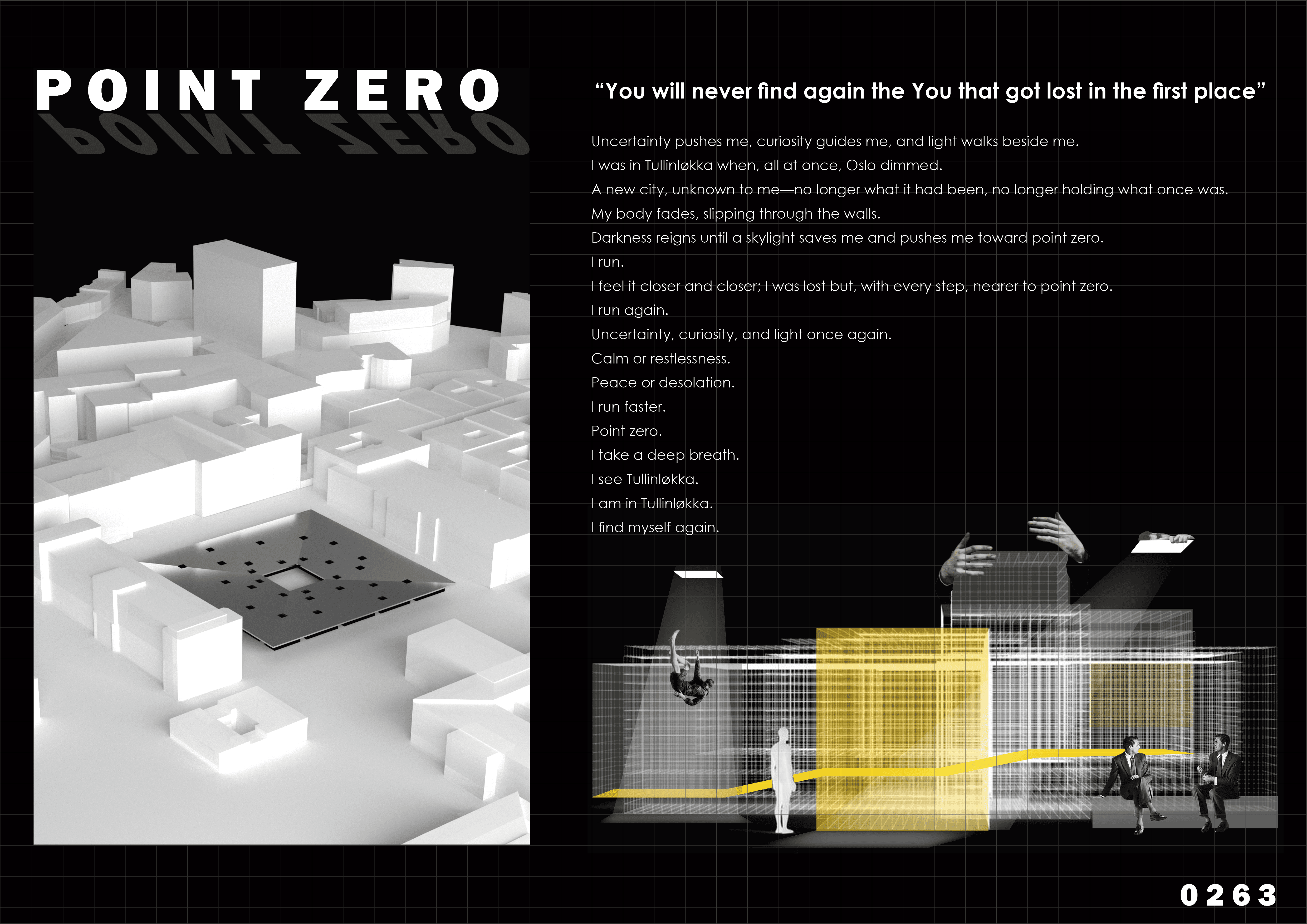 POINT ZERO. What is architecture without emotions? Inspired by the theme "Lost and Found: The Art of Losing", this pavilion is not just a structure, but an experience where disorientation ceases to be a mere concept and becomes a journey. As visitors wander through its labyrinthine passages, uncertainty pushes them, curiosity guides them, and light walks beside them. The limits between reality and dream blur: was the path they took real, or just an illusion? Darkness and revelation alternate until the skylight appears—an opening that leads toward point zero. From there, the journey is both physical and introspective. Running, breathing, searching, the visitor returns to Tullinløkka Square, faced again with the familiar city yet transformed by the experience. The pavilion thus acts as a threshold: a temporary presence that questions permanence, memory, and perception. The project embraces experimentation not only as a tool to test new forms of design and construction, but also as a way to propose new modes of sensing and inhabiting space. Material simplicity, spatial layering, and controlled light choreograph an encounter that is at once intimate and collective. Here, architecture ceases to be static; it becomes rhythm and pulse, a dreamscape anchored in the city, a moment of losing oneself in order to be found again.