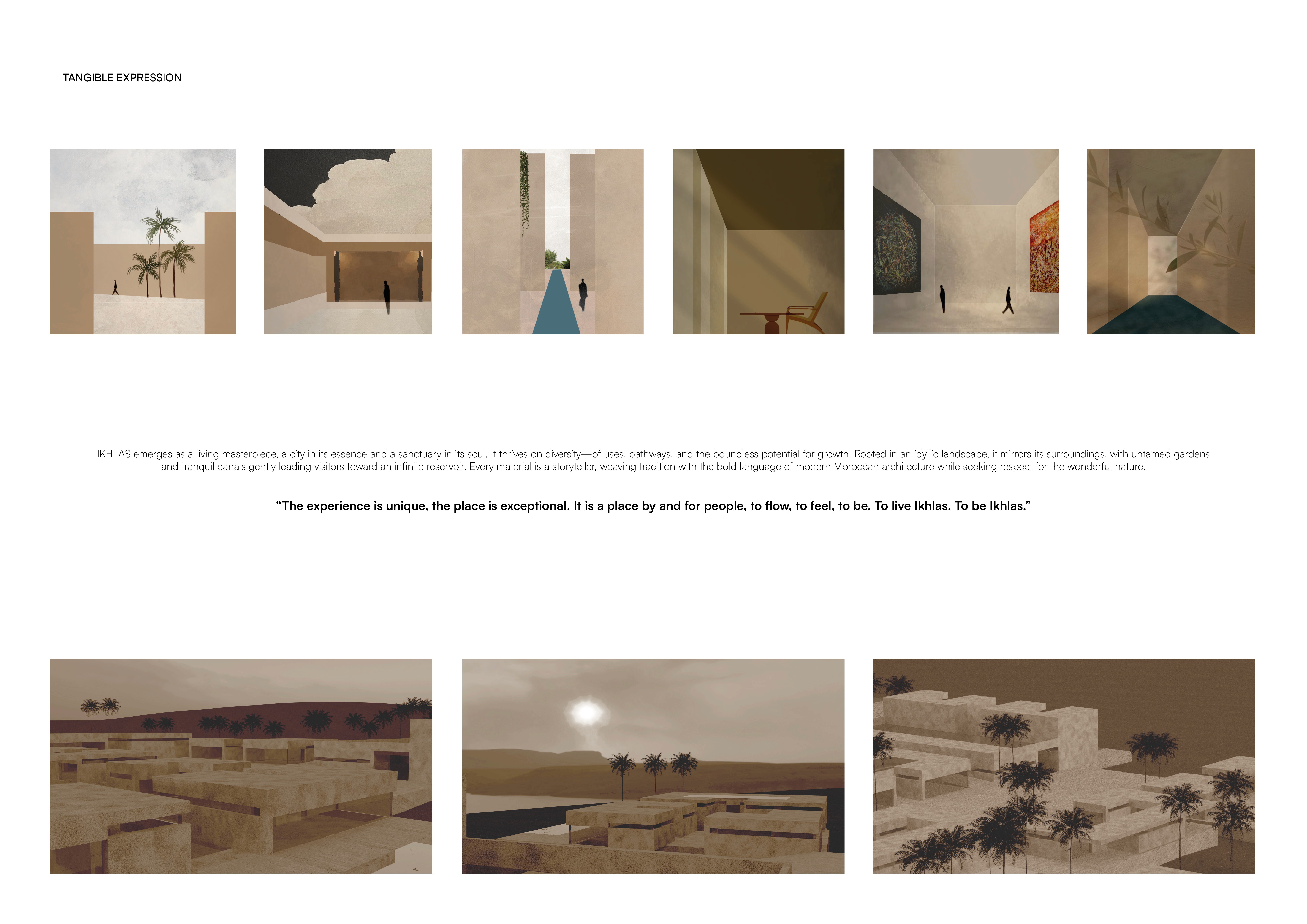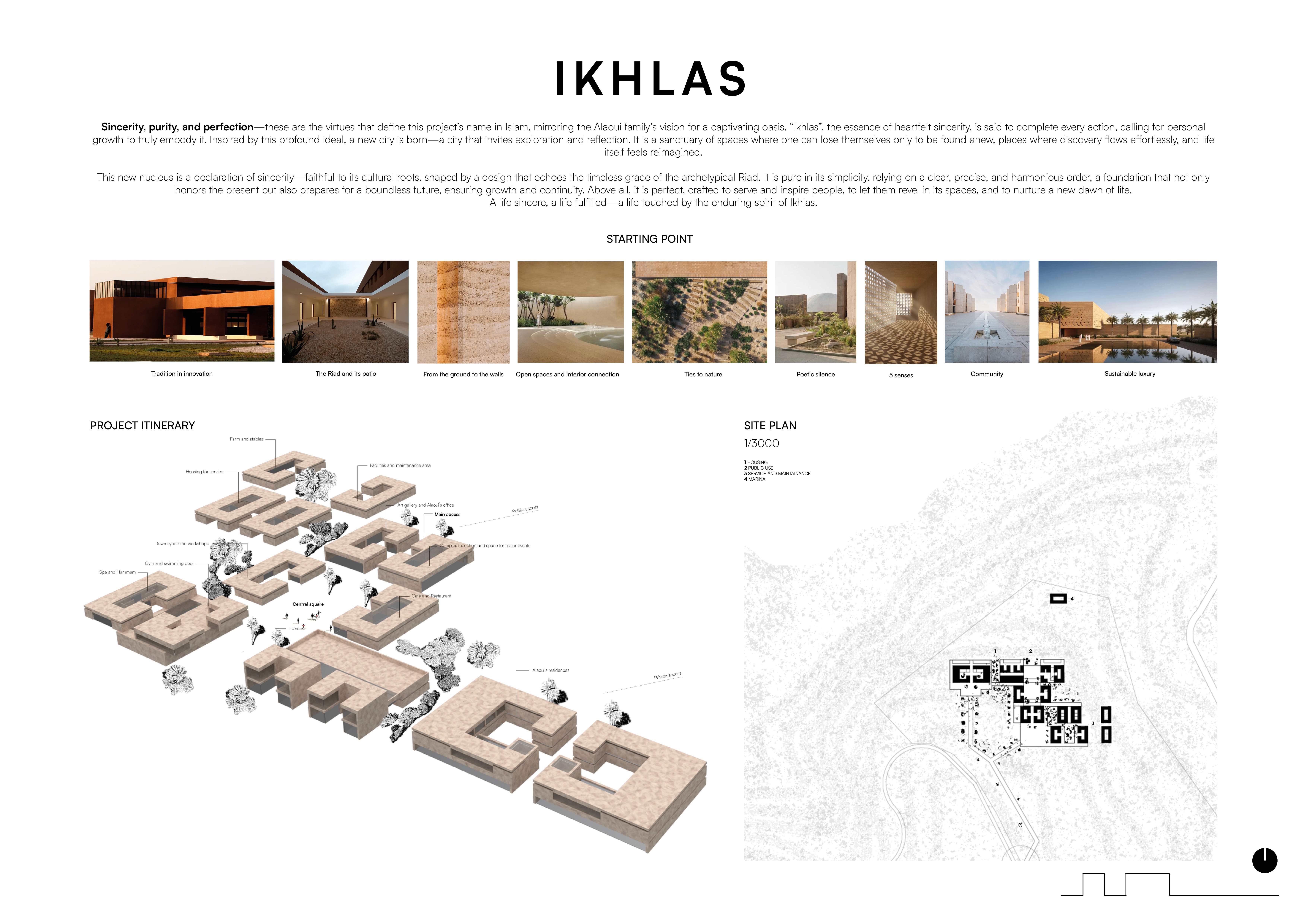 This new nucleus is a declaration of sincerity—faithful to its cultural roots, shaped by a design that echoes the timeless grace of the archetypical Riad. It is pure in its simplicity, relying on a clear, precise, and harmonious order, a foundation that not only honors the present but also prepares for a boundless future, ensuring growth and continuity. Above all, it is perfect, crafted to serve and inspire people, to let them revel in its spaces, and to nurture a new dawn of life. A life sincere, a life fulfilled—a life touched by the enduring spirit of Ikhlas.