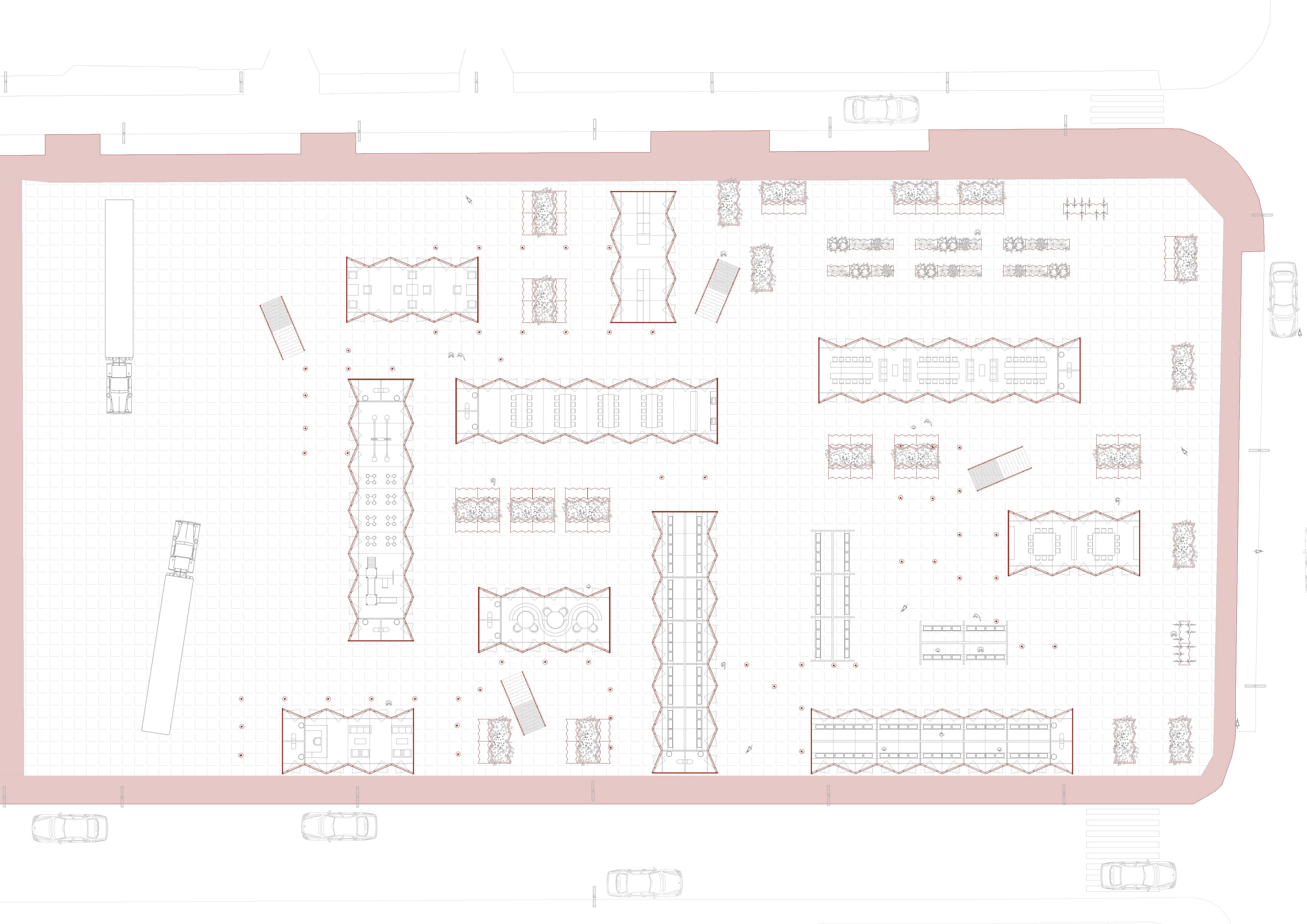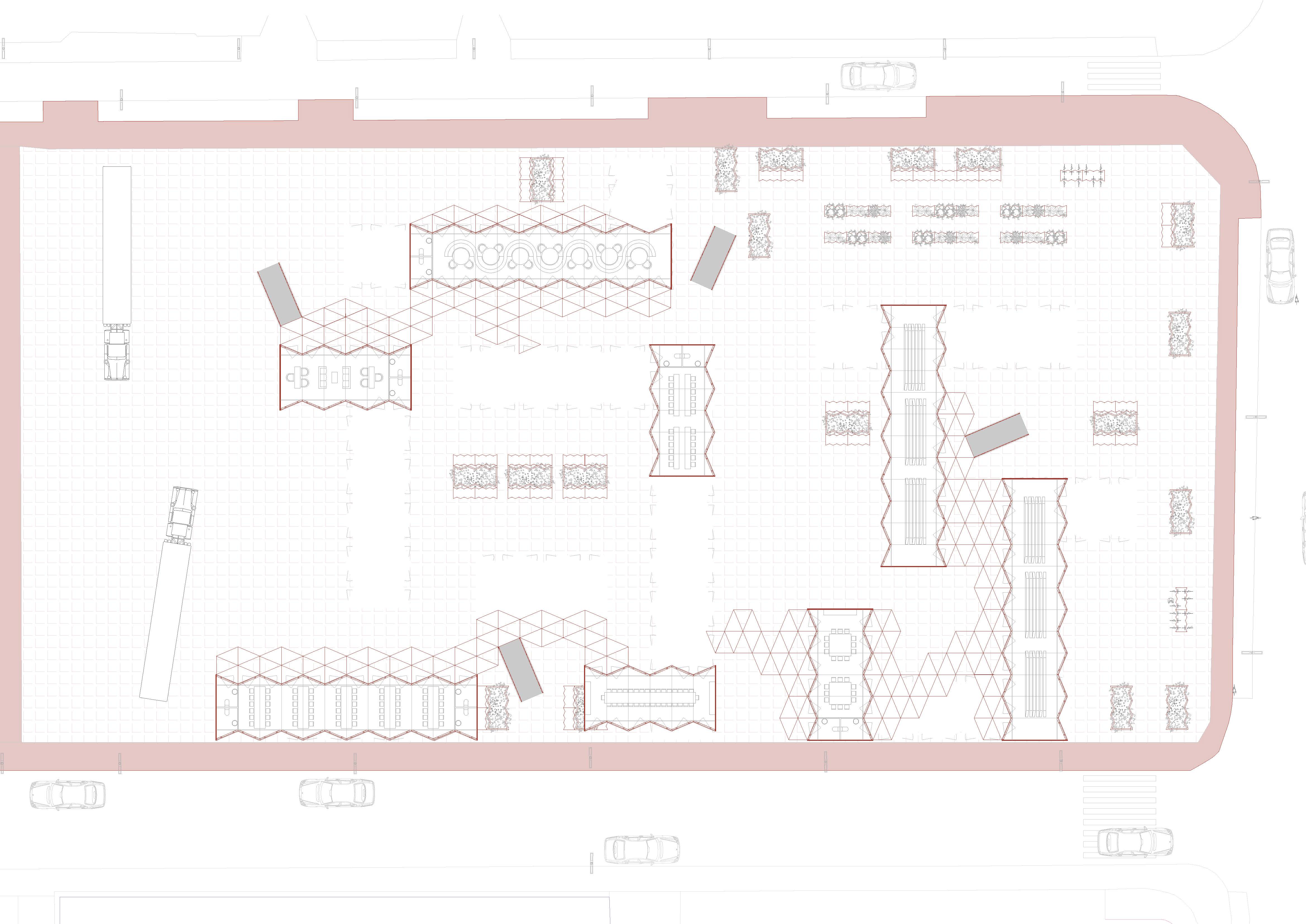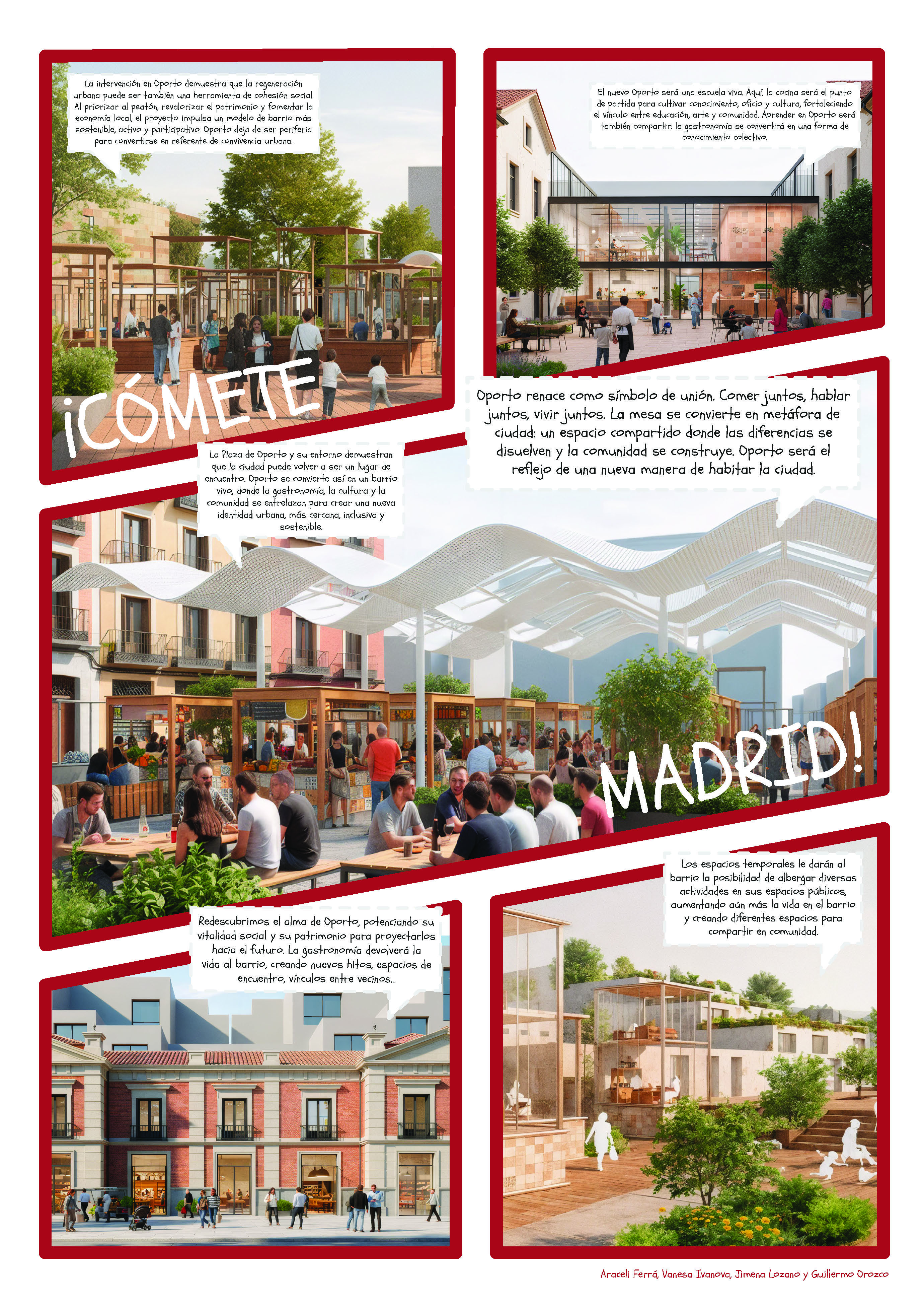 CÓMETE MADRID (Eat Madrid). The proposal understands the Plaza de Oporto and its surroundings as a strategic node within Madrid, shifting its condition from periphery to reference through a comprehensive urban regeneration. At the core of the project lies gastronomy as a social and cultural catalyst. The table becomes an urban device, activating public life and strengthening social bonds through everyday rituals. Markets, communal dining spaces and open kitchens introduce new places where people eat together, talk together and live together. The public realm is redefined by prioritising pedestrians, redistributing traffic and introducing new green areas. Streets and squares are transformed into safe, healthy and comfortable spaces, reconnecting the neighbourhood internally and with the rest of the city, encouraging permanence, encounter and shared use. Moreover, the project reclaims Oporto’s historical heritage, restoring its cultural and social significance, while simultaneously creating a new legacy that future generations can inhabit, learn from, and continue. With this projection, new housing must be introduced on underused plots and large open spaces, carefully integrated with the existing fabric and public spaces. This residential growth supports the arrival of new neighbours while reinforcing local life and community structures. Temporary and flexible spaces allow the neighbourhood to host diverse activities, ensuring constant urban vitality and adaptability over time. The regeneration of Oporto also strengthens the local economy, fostering small businesses, entrepreneurship and attracting visitors without displacing the existing community. By revaluing heritage, activating public space and promoting local production, the project proposes a sustainable and participatory urban model.
